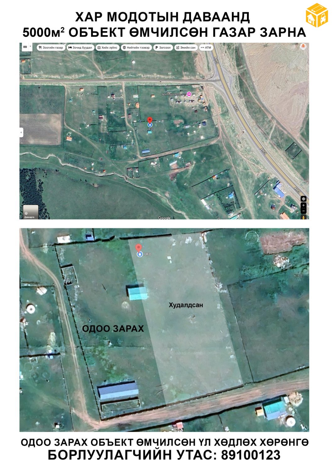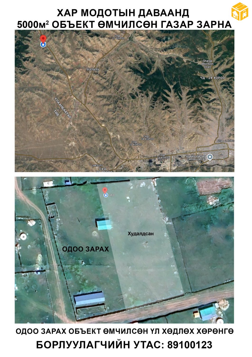 УБ, СХД, 21-р хороо, Хар модотын даваанд Агуулах бүхий өмчилсөн 5000m2 газар зарна.