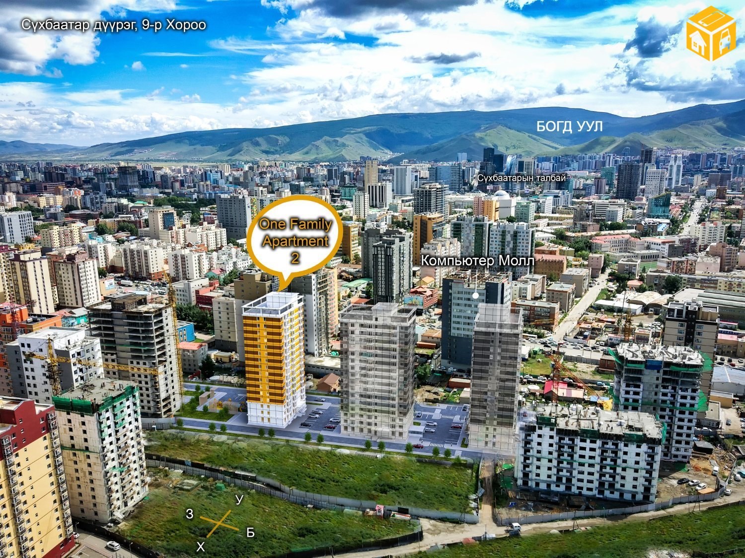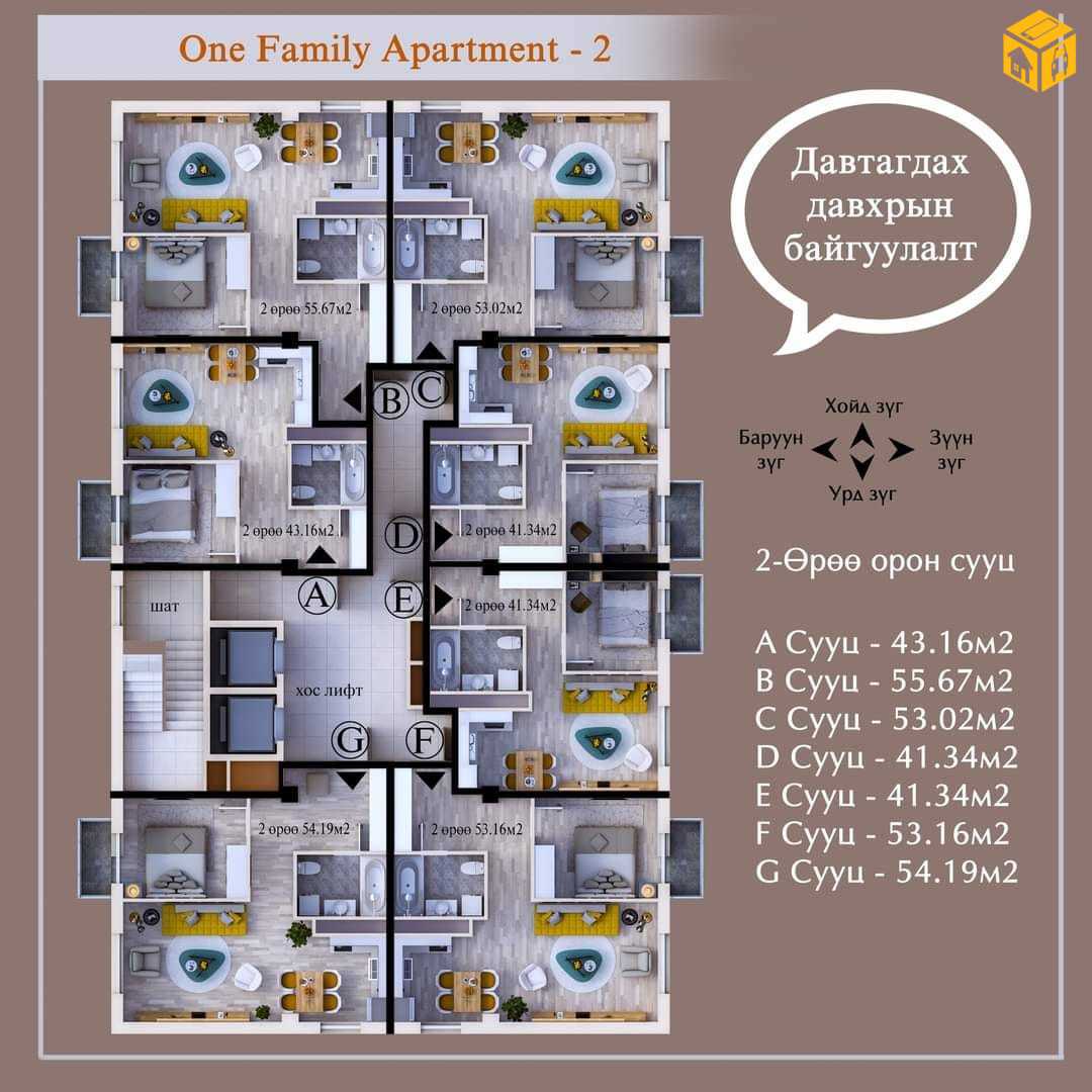 Нийт 54.19м2 талбайтай 16 давхарын 9-н давхарт урагшаа, баруун тийш харсан цонхтой 2 өрөө