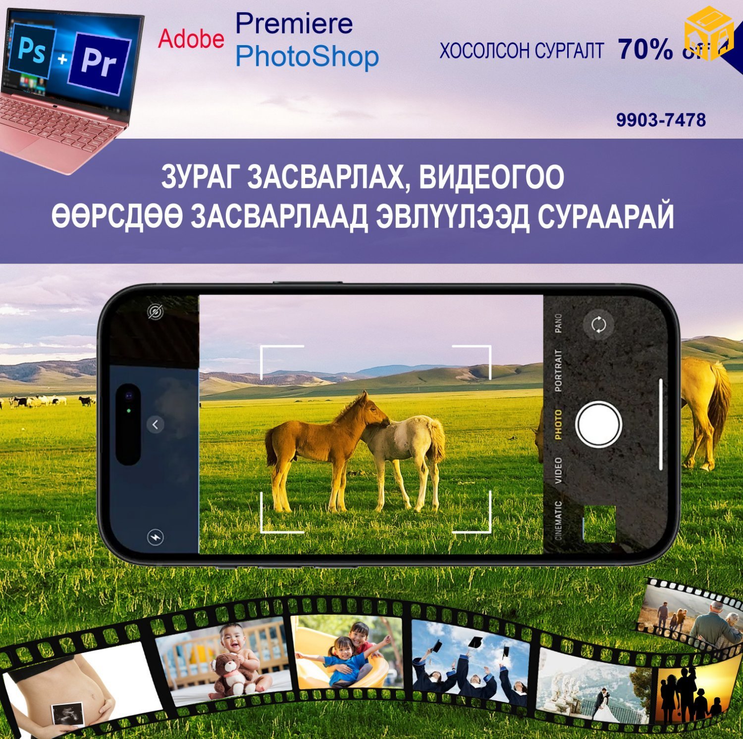 Тэгвэл зургаа засварлаад постероо өөрөө бэлтгэх, зураг бичлэгүүдээ монтажилж, эвлүүлээд нэмэлт бичвэр оруулах,зурагнууддаа ая дэвсээд, YOUTUBE-д өөрийн сувгаа үүсгээд байршуулах хосолсон сургалт хямдралтай үнээр зарлагдлаа.