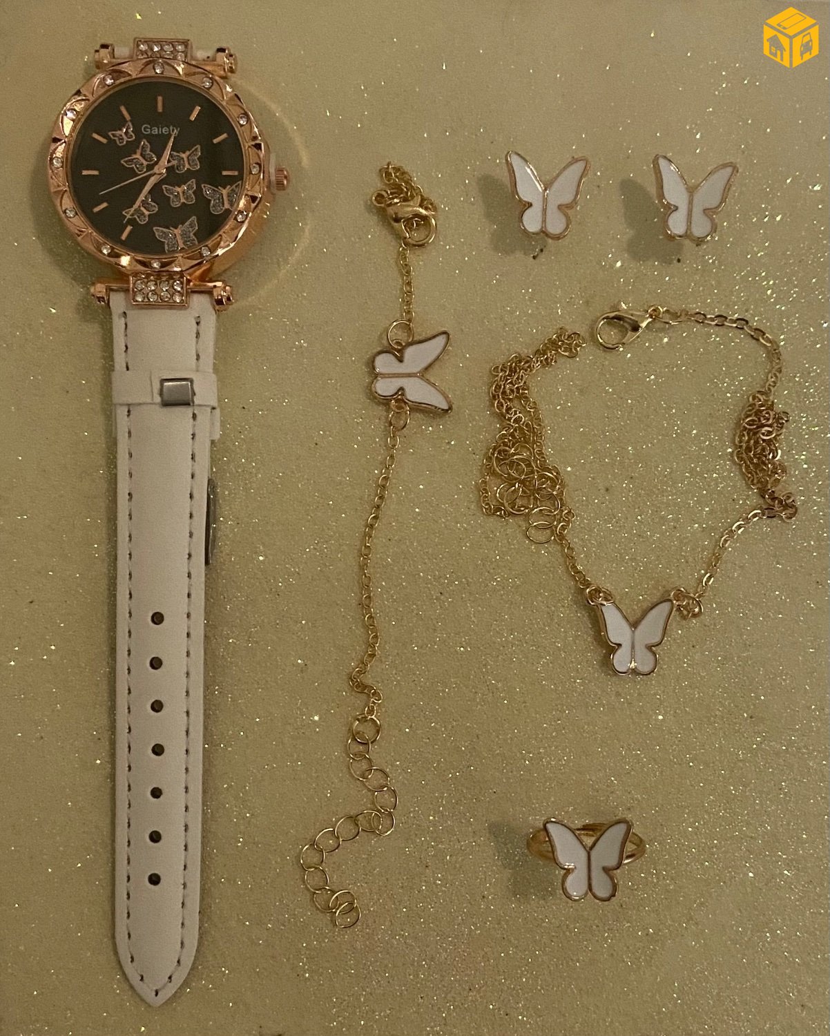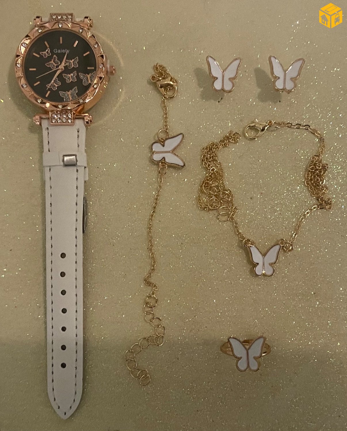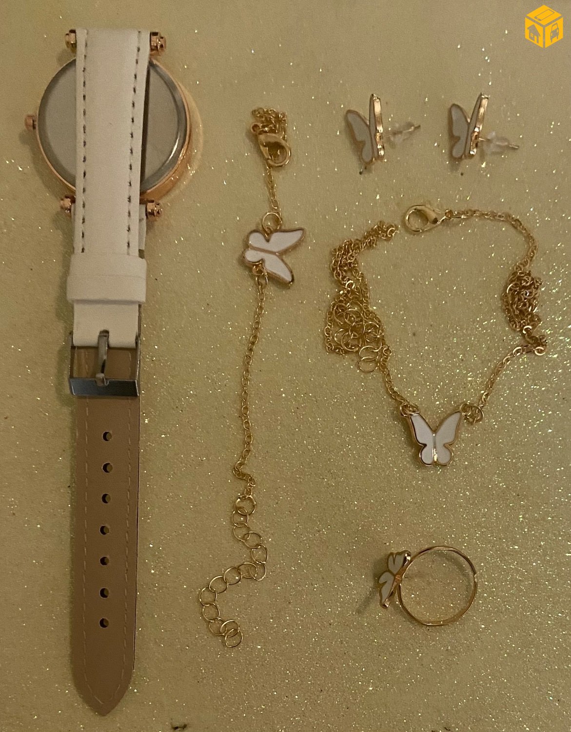 5 хос цаг. Ээмэг, бөгж, зүүлт, бугуйвч, цаг. Бөгж амтай.